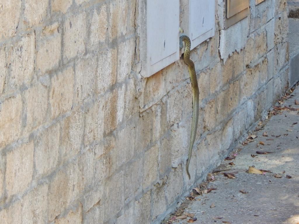 Oooops! Aesculapian snake, apparently. Harmless but looks wicked. And where exactly is it going?